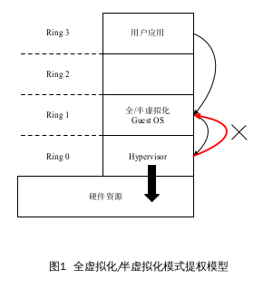 全虚拟化/半虚拟化的提权模型如图1所示。