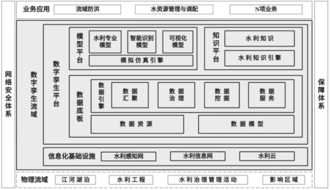 数字孪生流域是智慧水利建设的核心与关键,以水利感知网、水利信息网、水利云等为基础,运用大数据、人工智能、虚拟仿真等技术,以物理流域为单元、多维时空数据为底板、水利模型为核心、水利知识为驱动,对物理流域全要素和水利治理管理活动全过程进行数字化映射、智能化模拟,支撑实现流域防洪、水资源管理与调配“四预”以及N项水利智能业务应用。