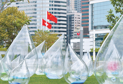 香港中环添马公园,如茵的草坪上摆放着大大小小的透明“水滴”,孩子们穿梭其间,开心玩耍。这是香港特区政府发展局及水务署举办的“舞动水滴展”,5月11日,一个28.8米高的巨型“水滴”首次展出。