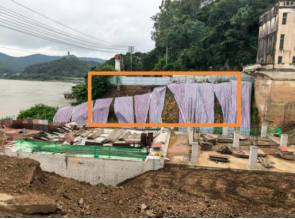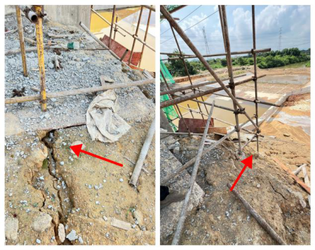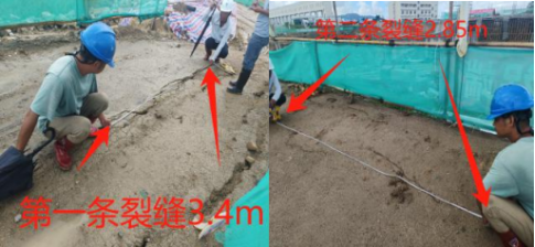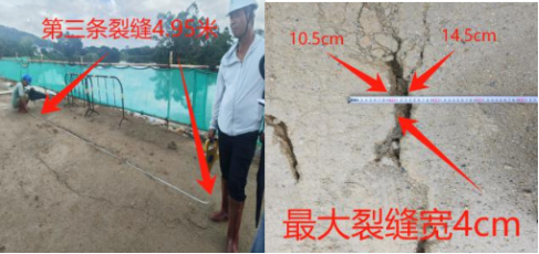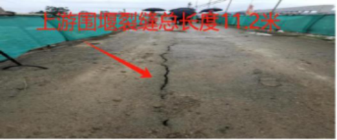 3.**水闸重建工程上游围堰局部段填筑质量不满足要求,堰顶出现裂缝,总长度约11.2m,其中最大一条裂缝长约4.95m,宽度达4cm,围堰已发生沉降。此外,上游围堰左岸连接段未严格按设计断面填筑,上部呈松散堆填状态,堰顶可见雨水冲刷痕迹。不符合《水利部印发〈关于加强在建水利工程安全度汛工作的指导意见〉的通知》(水建设〔2024〕16号)第四、(十三)条。根据水利部《水利水电工程生产安全重大事故隐患判定导则》(SL/T 842—2025)第4.2.3条,判定为重大事故隐患。