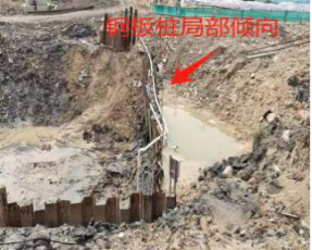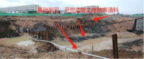 2.**水闸重建工程上游左岸BC段U型槽基坑目前正处于开挖施工阶段,该基坑属U型槽结构,最大开挖深度约8m,属于深基坑工程。目前该基坑在支护与开挖过程中存在以下问题:(1)当前基坑仅开挖至槽底设计高程,仍剩余约2~3m厚的U型槽基础软弱土层尚未开挖,若继续下挖,可能加剧现有钢板桩支护结构的变形。同时,基坑边坡顶部位于是施工车辆通行的交通道路,动荷载作用进一步增加了边坡失稳的风险,施工单位未采取任何加固措施;(2)开挖过程中未对基坑边坡及周边布设监测点,也未开展变形及位移监测工作;(3)基坑边坡顶部堆放有弃渣料,且未设置截水或排水措施。不符合《水利水电工程施工安全管理导则》(SL 721—2015)第7.3.9条。根据水利部《水利水电工程生产安全重大事故隐患判定导则》(SL/T 842—2025)第4.3.7条,判定为重大事故隐患。