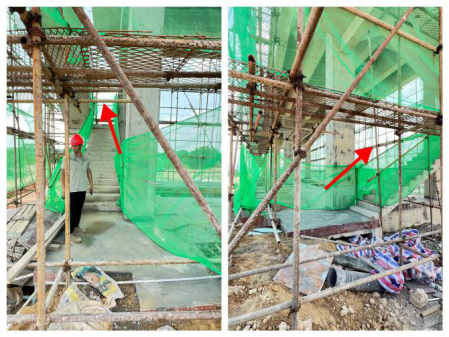 4.**水闸重建工程所搭设的扣件式钢管脚手架(长度38m,高度15m)存在以下不合规情况:(1)脚手架左右两侧出入口均未设置安全防护设施;(2)右侧下游面部分立杆支撑于临空斜坡上,该处土体已出现多处开裂,处于不稳定状态。不符合《水利水电工程施工安全防护设施技术规范》(SL 714—2015)第3.3.6条。根据水利部《水利水电工程生产安全重大事故隐患判定导则》(SL/T 842—2025)第4.4.1条,判定为重大事故隐患。